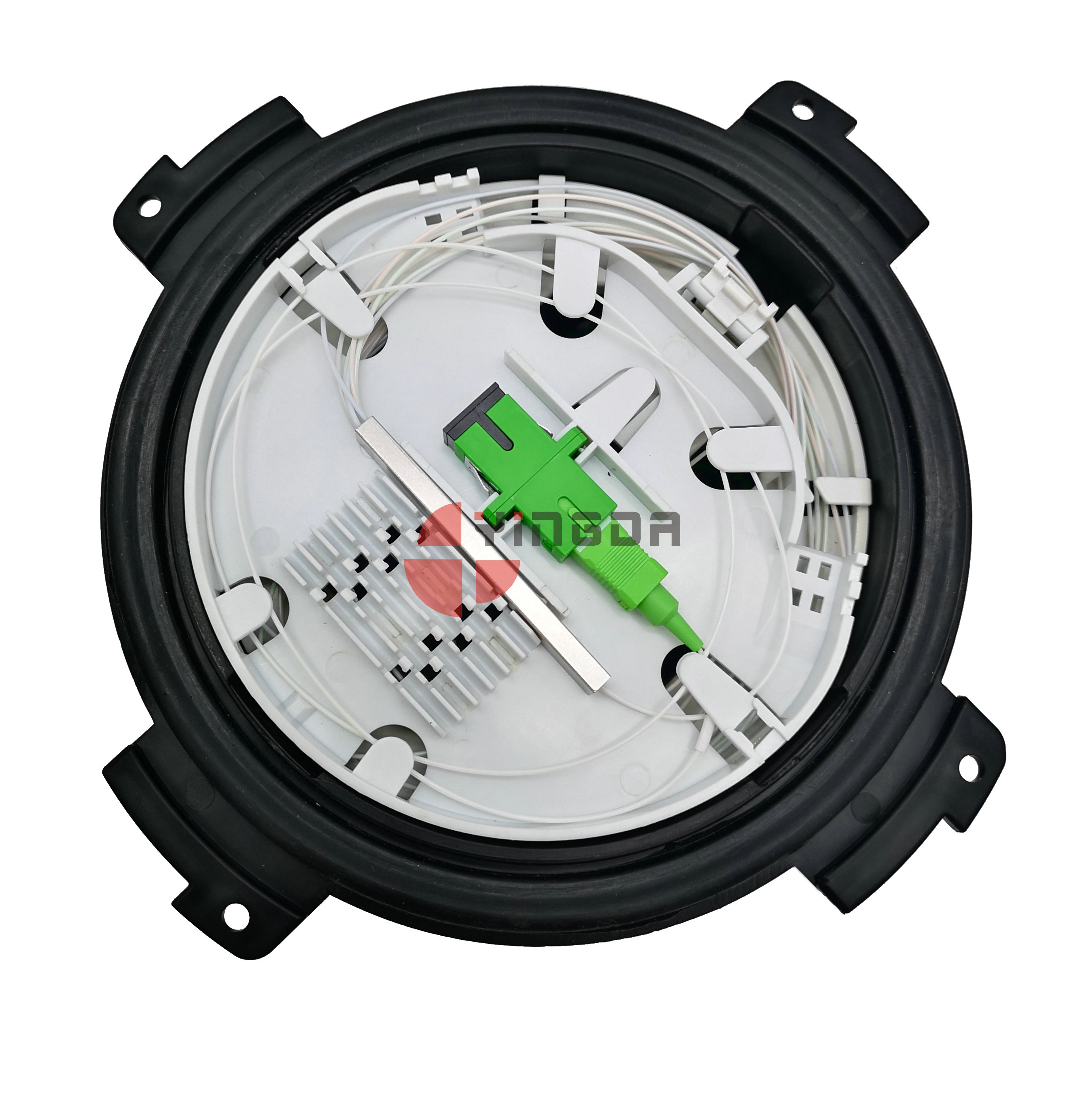 it is small size, light weight, large capacity:12cores for fusion ,can hold 1pc 1 to 8 plc splitter in the fusion splice tray, and there is SC adapter holder to fix the input of the splitter, you can put the splitter steel tube in the tray too.